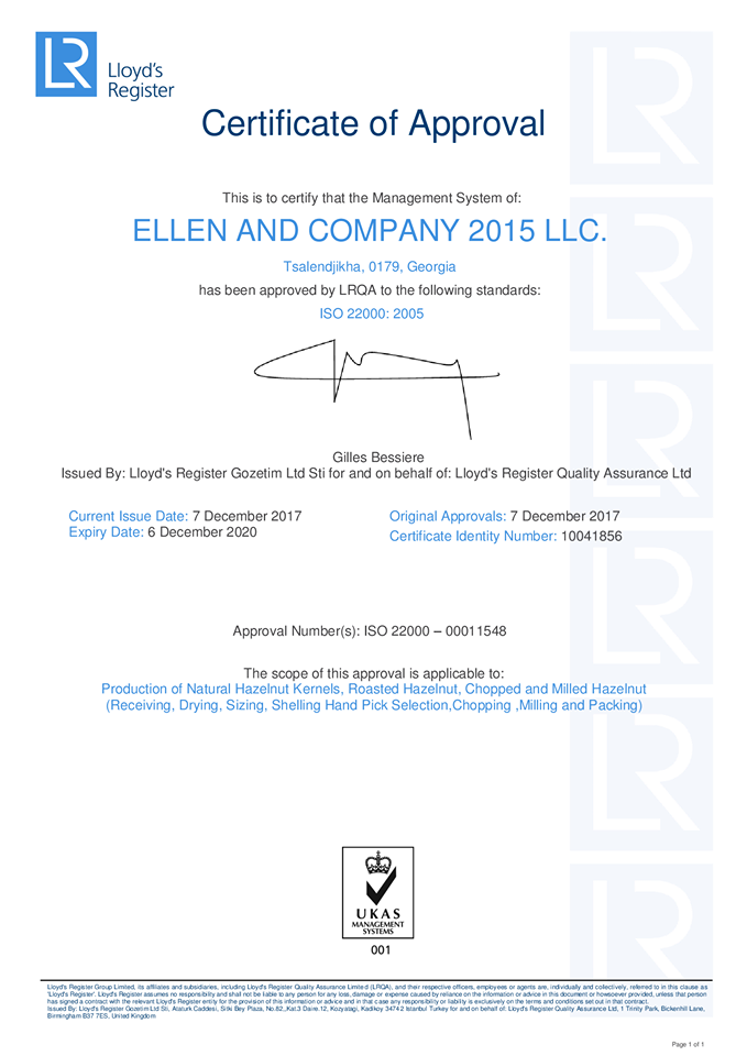 თხილის გადამამუშავებელმა საწარმომ ISO სერთიფიკატი მიიღო