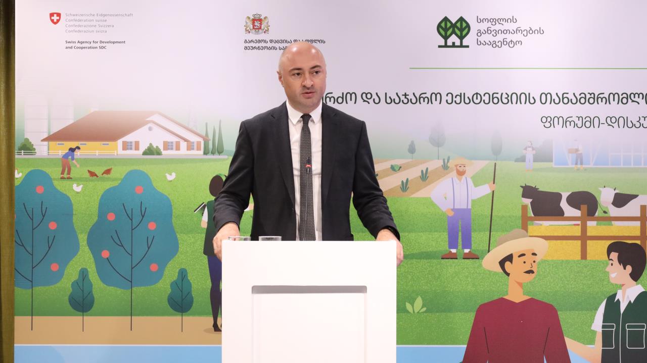 Deputy Minister of Environmental Protection and Agriculture, Solomon Pavliashvili, opened the forum "Public and Private Extension Cooperation," organized by the Rural Development Agency within the framework of the third phase of the "Modernizing the Vocational Education System in Agriculture in Georgia" (VET) project, with a welcome speech.